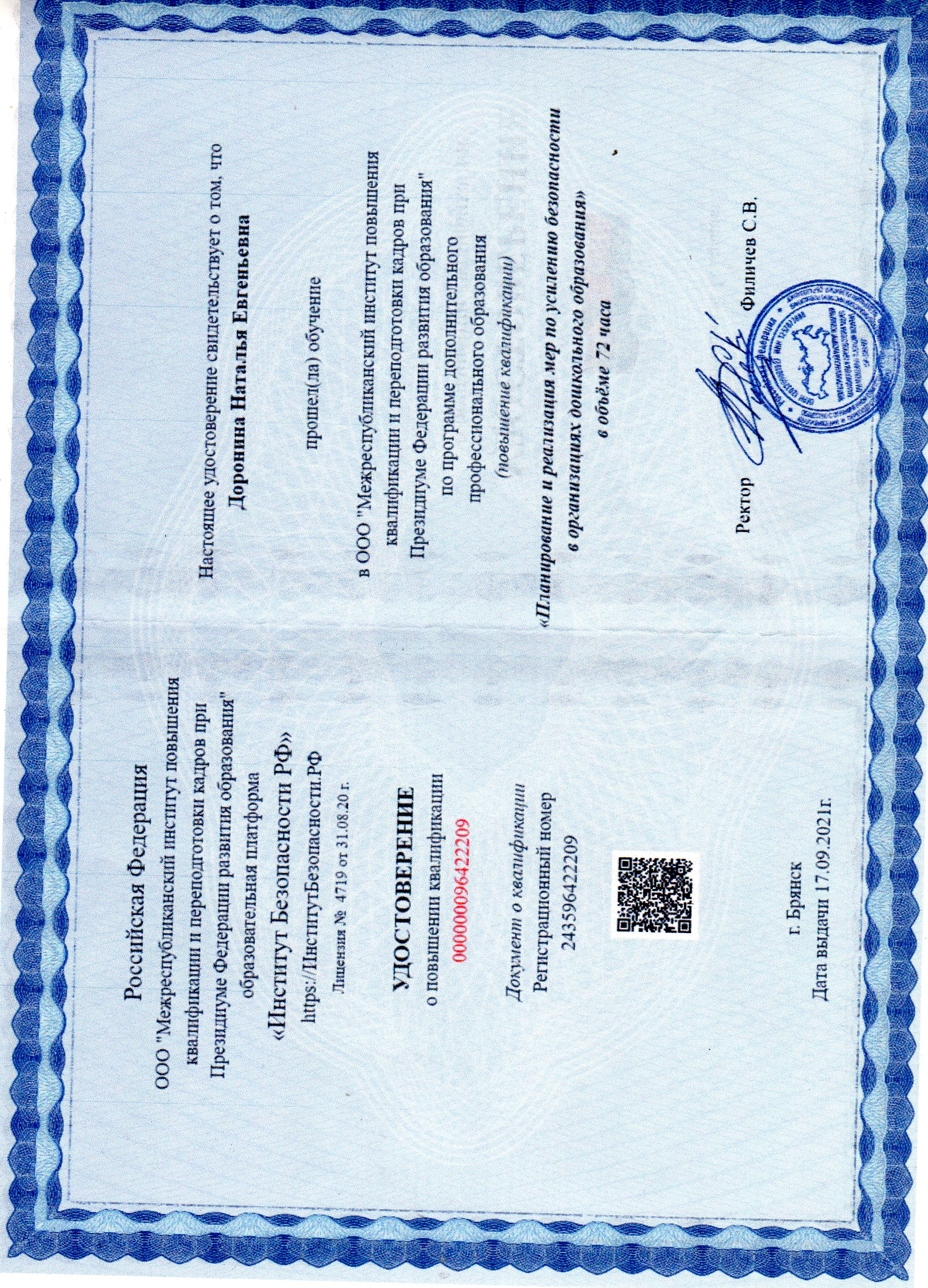 Удостоверение о повышении квалификации "Планирование и реализация мер по усилению безопасности в организациях дошкольного образования"